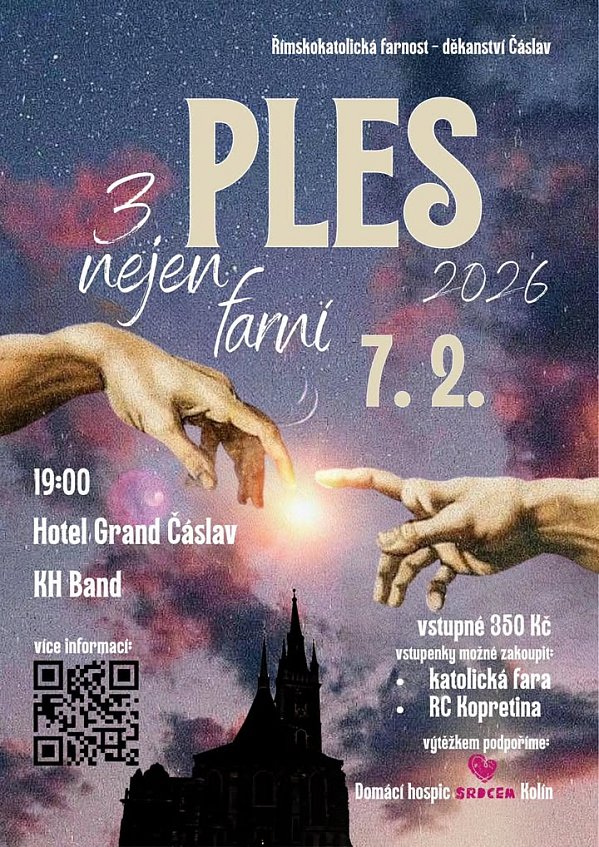 Římskokatolická farnost – Děkanství Čáslav zve na 3. ročník nejen farního plesu, který je určený všem, kdo si chtějí zatančit, ale i se skvěle bavit a užít si jedinečnou atmosféru s večerním překvapením. K poslechu i tanci se mohou návštěvníci těšit na KH Band.